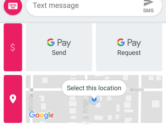 Probablemente sepa que Android Messages le permite agregar pegatinas y fotos a una conversación, pero hay más escondite en ese menú. Toque el botón más en una conversación y obtendrá una lista de pegatinas y otras cosas divertidas. Desplázate hacia abajo y llegarás a lo bueno. Puede agregar su ubicación, una nota de voz e incluso enviar o solicitar dinero a través de Google Pay. Debe otorgar acceso a la ubicación para disfrutar de estas funciones. Tenga en cuenta que Google Pay funciona en conversaciones uno a uno solo después de que haya configurado la aplicación Pay.