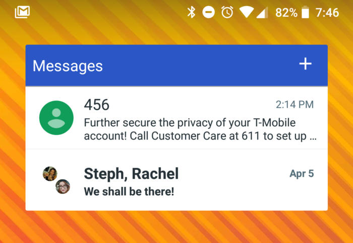 En realidad, hay dos opciones diferentes de widgets para mensajes de Android: una que muestra el mensaje más reciente en todas sus conversaciones, y otra que muestra una sola conversación de su elección. La versión de conversación única también tiene un cuadro de composición emergente para enviar mensajes nuevos.