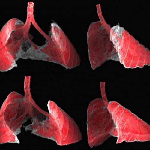La figura muestra dos vistas, frontal y lateral, de la imagen obtenida por TAC de los pulmones de un ratón con fibrosis (zonas grises) antes y después de ser tratado con nanoterapia dirigida a las células senescentes con el nanovehículo para liberar fármacos en células dañadas. (Foto: G Garaulet i F Mulero, CNIO)