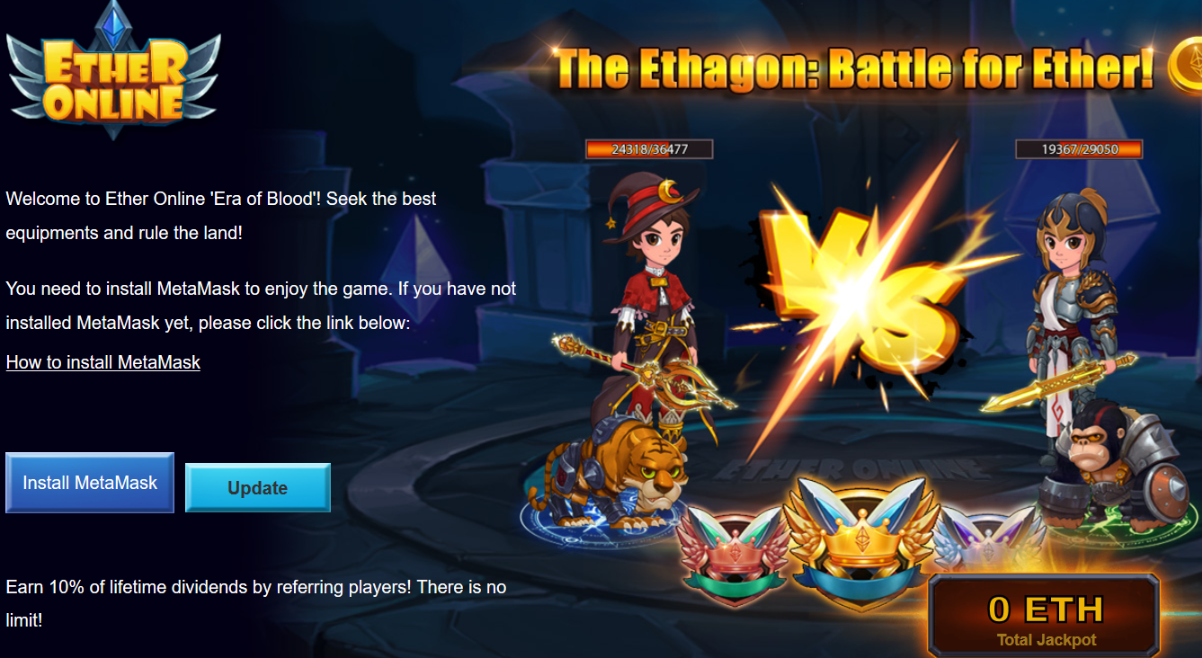 Uno de los primeros MMORPG del mundo (juegos de rol multijugador masivo en línea) basado en blockchain, Ether Online permite a los jugadores luchar entre ellos, comprar o intercambiar equipos, luchar contra monstruos en el mundo y recoger premios. Las diferentes variedades de equipos y mascotas son activos digitales únicos. Son propiedad de usted y puede comprarlos y venderlos como desee.