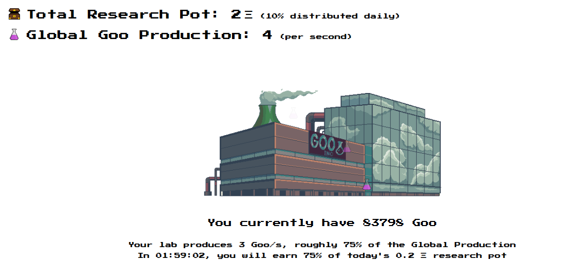 En este juego, produces Goo y puedes aumentar tu producción de Goo comprando científicos y actualizaciones. Esto además de ganar dividendos en función del porcentaje de tu producción en todo el mundo. Todos los científicos pueden venderse por el 75% de su precio de compra ETH o Goo. Una rifa le permite ganar ETH gastando boletos de Goo. ¡Puedes gastar tu Goo en los Barracones para atacar a otros jugadores!
