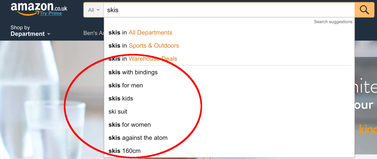 Comencemos con Amazon. Primero, escribe una de tus palabras clave en la barra de búsqueda: