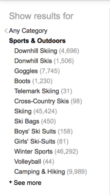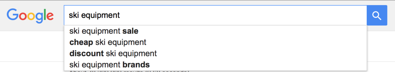 Esquís, comprar esquís, precios de esquí, bastones de esquí, guantes de esquí, botas de esquí, etc. Ese es un buen comienzo. Pero, busquemos algunas palabras clave más específicas.