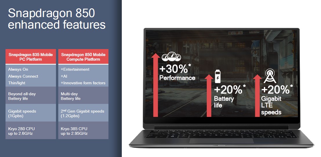 En Computex 2018, Qualcomm ha anunciado el Qualcomm Snapdragon 850 Processor, un procesador y plataforma dedicados a Windows 10. Snapdragon 850 será la base tecnológica para las próximas PC Always-Connected, continuando la tendencia lanzada por las computadoras portátiles como el Lenovo Miix 630, Asus NovaGo y el HP Envy X2.