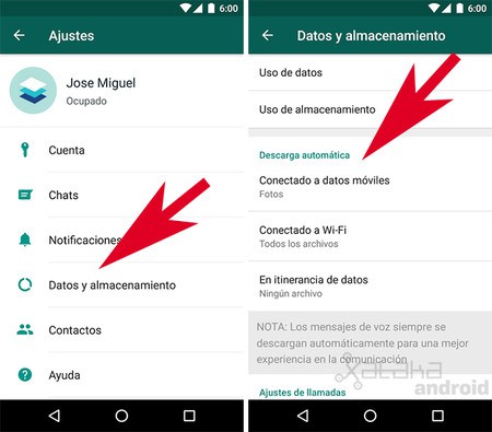Puede ser algo no tan complicado solventar este problema si WhatsApp puede ralentizar el teléfono. Si tienes un dispositivo Android, todo lo que tienes que hacer es ingresar la configuración de WhatsApp, buscar la opción ‘Datos y almacenamiento’ y finalmente buscar ‘Descarga automática’, donde debes desactivar todo.
