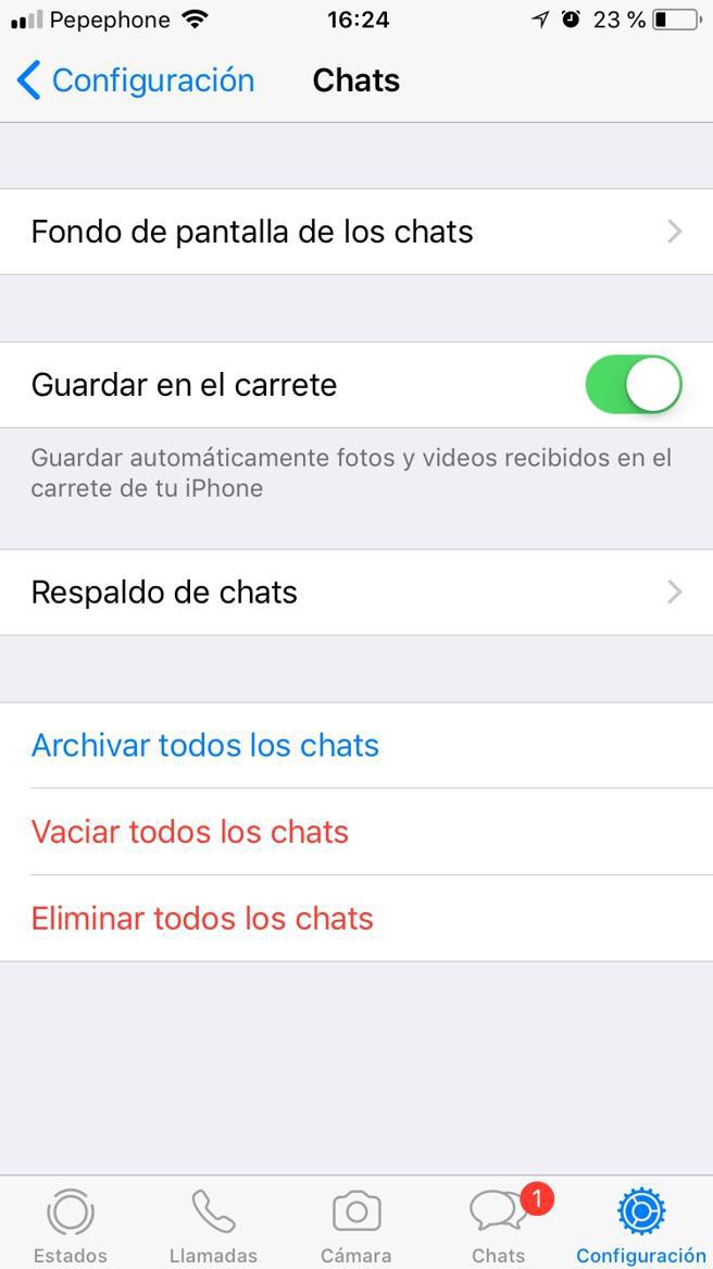 En caso de que tenga un iPhone u otro dispositivo Apple. Usted debe ir a ‘Configuración’, luego a ‘Chat’ y desactivar la opción ‘Guardar en el carrete’. Así sería, ahora solo descargarás los archivos multimedia que quieras.